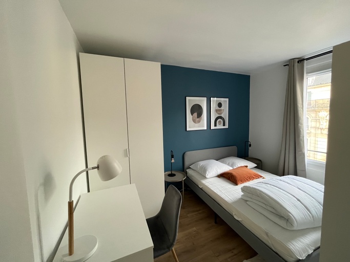 Au 6e étage avec ascenseur d’un charmant immeuble, grande CHAMBRE PRIVATIVE au sein d’un bel appartement partagé de 40m2 avec salon, cuisine aménagée et équipée et salle d’eau avec WC (espaces partagés).